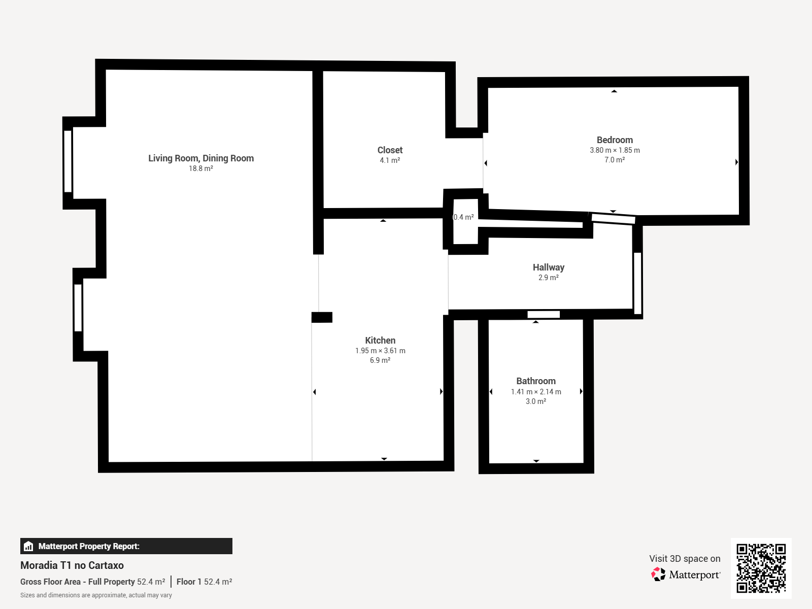 Composta por Sala e Cozinha (equipada com fogão, exaustor e frigorífico); Quarto com Closet e Wc Completo.